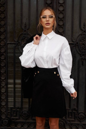 Блузка свободного кроя, выполнена из блузочной ткани.Застежка на петли и пуговицы.Воротник рубашечный. Плечо спущено. Рукав втачной со сборкой по окату и низу. Низ с притачной манжетой, застегивающейся на пуговицу.Спинка с отрезной кокеткой и двумя складками. Низ фигурной формы. Длина рукава - 58 см.