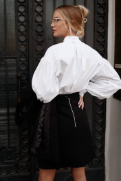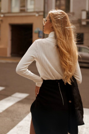 Юбка укороченная, А-образного силуэта, из костюмной ткани, на подкладке.Перед юбки с отрезными бочками на 3 декоративные пуговицы, с имитацией двойной юбки и со смещённым разрезом.Задняя часть юбки со средним швом и металлической молнией. Пояс притачной на петлю и пуговицу. 42 р-р: ОТ - 68 см., ОБ - 92 см. 44 р-р: ОТ - 72 см., ОБ - 96 см. 46 р-р: ОТ - 76 см., ОБ - 100 см. 48 р-р: ОТ - 80 см., ОБ - 104 см.