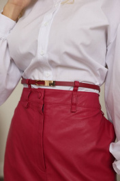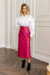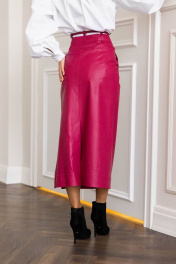 Юбка прямого силуэта, изготовлена из искусственной кожи, длина макси. Застежка на молнию и кнопку на отрезном поясе со шлевками и ремнем по талии. Боковые наклонные карманы и высокий разрез в левом боковом. Сзади средний шов и шлица. Юбка без подкладки.