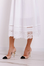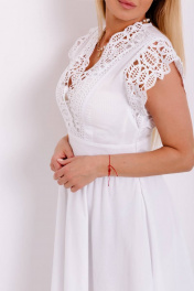 Платье выполнено из хлопкового полотна в сочетании с хлопковым кружевом, на подкладке по низу (50 см). Застежка на потайную тесьму-молнию в левом боковом шве. Платье отрезное по талии, по нижней части присборенно. Длина изделия - 117 см. Длина рукава - от горловины 18 см. 44 р-р: ОГ - 90 см., ОТ - 76 см.; 46 р-р: ОГ - 94 см., ОТ - 80 см.; 48 р-р: ОГ - 100 см., ОТ - 84 см.; 50 р-р: ОГ - 106 см., ОТ - 90 см.