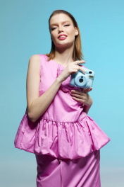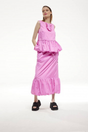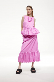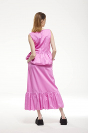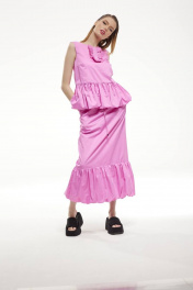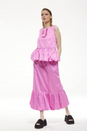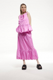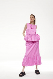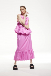 Комплект юбочный 2-х предметный (блузка + юбка).Блузка выполнена из ткани тафта. Спереди рюш на планке, украшен декоративной тесьмой. Застёжка сзади на петлю и пуговицу. Низ блузки с эффектом «баллон». На подкладке. Юбка прямая из хлопковой ткани. Длина миди. Форма низа «баллон». По верху пояс собран на резинку. В кулису пояса вставлен шнур-завязка. В боковых швах карманы. "44 р-р: блузка: ОГ - 96 см., ОТ - 104 см., ОБ - 136 см. (по низу изделия).; юбка: ОТ - 66 см. (в растянутом виде - 90 см.), ОБ - 98 см. 46 р-р: блузка: ОГ - 100 см., ОТ - 108 см., ОБ - 140 см. (по низу изделия).; юбка: ОТ - 70 см. (в растянутом виде - 94 см.), ОБ - 102 см. 48 р-р: блузка: ОГ - 104 см., ОТ - 112 см., ОБ - 144 см. (по низу изделия).; юбка: ОТ - 74 см. (в растянутом виде - 98 см.), ОБ - 106 см. 50 р-р: блузка: ОГ - 108 см., ОТ - 116 см., ОБ - 148 см. (по низу изделия).; юбка: ОТ - 78 см. (в растянутом виде - 102 см.), ОБ - 110 см. "