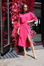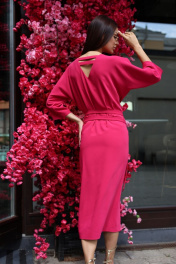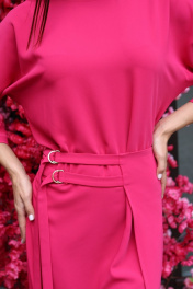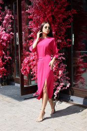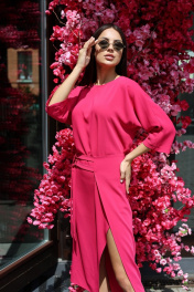 Платье полуприлегающего силуэта. Длина мини. Горловина по переду круглая, по спинке V-образная с перемычками. Рукав «летучая мышь», длина 3/4. В левом боковом шве отлетная деталь с регулируемыми ремешками по талии. По переду разрез. Длина рукава - 51 см. Длина рукава 51 см. Длина платья 123 см. (от плечевого шва) Измерения по готовому изделию 44 р-р: ОГ - 102 см., ОТ - 98 см., ОБ - 98 см. 46 р-р: ОГ - 106 см., ОТ - 102 см., ОБ - 102 см. 48 р-р: ОГ - 110 см., ОТ - 106 см., ОБ - 106 см. 50 р-р: ОГ - 114 см., ОТ - 110 см., ОБ - 110 см.