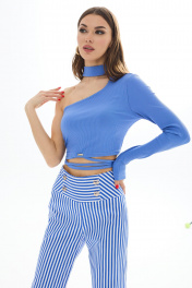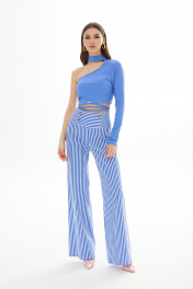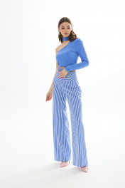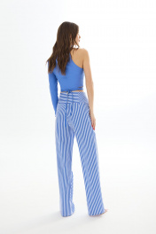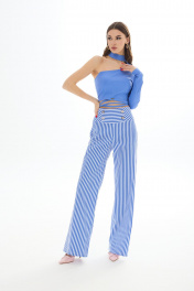 Брюки прямые из хлопковой ткани. Верх на высокой кокетке. Застежка сзади на декоративную молнию. На кокетке передних частей брюк декоративные пуговицы. Измерения по готовому изделию: 42 р-р: ОТ - 69 см., ОБ - 94 см. 44 р-р: ОТ - 73 см., ОБ - 98 см. 46 р-р: ОТ - 77 см., ОБ - 102 см. 48 р-р: ОТ - 81 см., ОБ - 106 см.