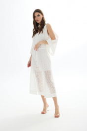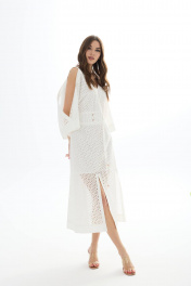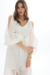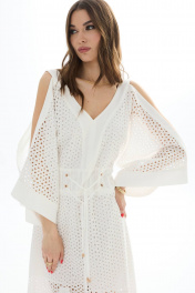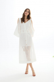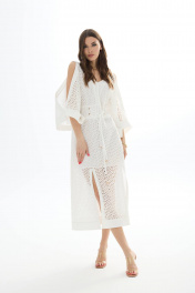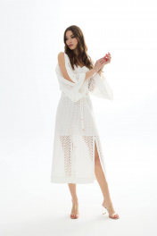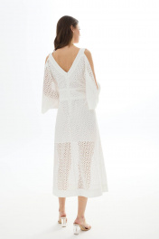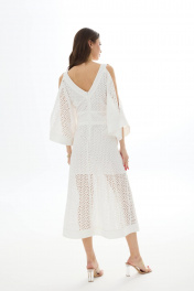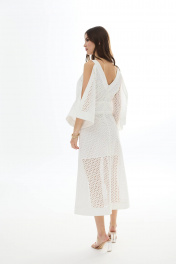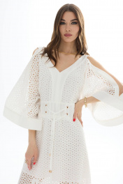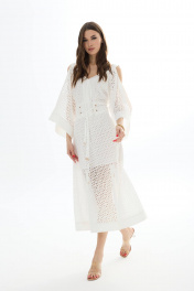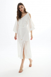 Платье из хлопковой ткани «ришелье». Длина миди. Вырез горловины V-образный по переду и спинке. Застежка по спинке на потайную молнию. Рукав цельнокроеный с открытым плечом. По талии пояс-кокетка с декоративной сборкой и завязками. По низу переда разрезы. Платье на подкладке. 44 р-р: ОГ - 94 см., ОТ - 84 см., ОБ - 102 см. 46 р-р: ОГ - 98 см., ОТ - 88 см., ОБ - 106 см. 48 р-р: ОГ - 102 см., ОТ - 92 см., ОБ - 110 см. 50 р-р: ОГ - 106 см., ОТ - 96 см., ОБ - 114 см. 52 р-р: ОГ - 110 см., ОТ - 100 см., ОБ - 118 см.