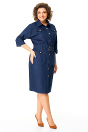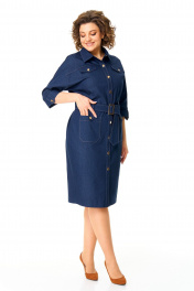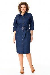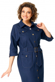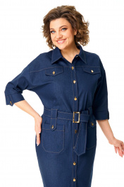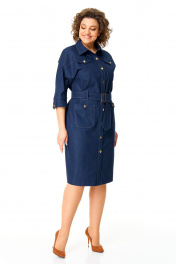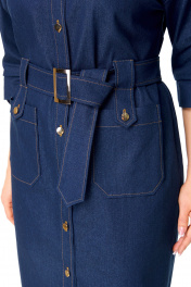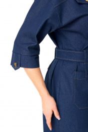 Платье женское полуприлегающего силуэта, заужено к низу. Рукав цельнокроеный типа "летучая мышь" длиной 3/4. Низ рукава с манжетой, патой и пуговицей. Горловина обработана блузочным воротником на отрезной стойке. Перед с планкой и застежкой на петли-пуговицы. По переду, в шов притачивания кокетки вставлены клапаны. Перед и спинка с отрезными кокетками. На полочке имеются накладные карманы. По спинке застрочены односторонние сладки. Для поддержания навесного пояса выполнены шлевки в виде пат с отделочными пуговицами. Навесной пояс с пряжкой под золото. Отделочные строчки выполнены нитками контрастного цвета.