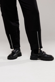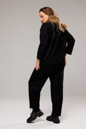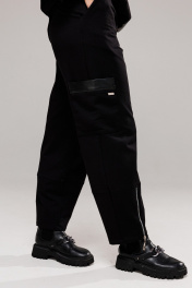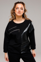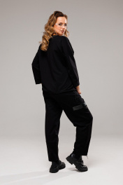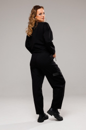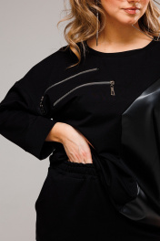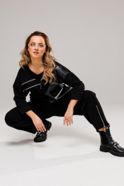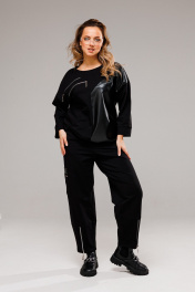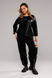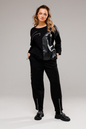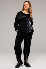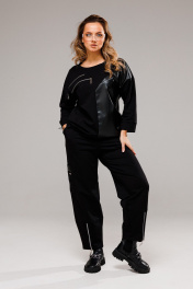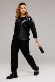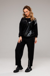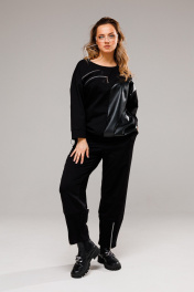Костюм женский, состоит из свитшота и брюк. Свитшот свободного покроя со спущенной линией плеча. Перед поделен декоративным рельефом на две части из основного полотна и эко кожи. На правой части переда обработаны декоративные молнии. Рукав длинный с манжетой по низу. По низу свитшота выполнена кулиса с резинкой и фиксатором. Горловина округлой формы, обработана эластичной бейкой. Брюки прямого силуэта, с отрезной манжетой, создающей эффект зауженности низа брюк. По переду манжет обработаны застежки на тесьму-молнию. Пояс притачной на резинке. В боковых швах карманы. С правой стороны выполнен накладной карман.