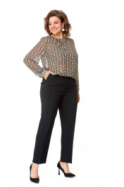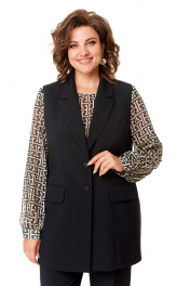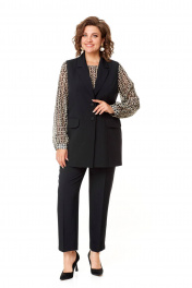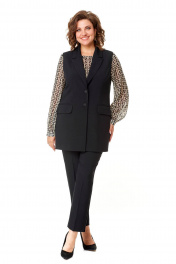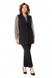 Комплект женский, состоит из жилета, брюк и блузки. Жилет удлиненный полуприлигающего силуэта на подкладке. Спинка со средним швом и рельефами из проймы. Перед с рельефами из проймы, прорезными карманами "в рамку" и клапанами. Застежка центрально-бортовая на петли пуговицы. Воротник отложной пиджачного типа. Брюки зауженные к низу, с центральной застёжкой на молнию и петлю-пуговицу. По передним и задним половинкам заутюжены "стрелки". В боковых швах карманы. Пояс притачной с резинкой по бокам. Блуза из шифона с принтом "фенди". Горловина округлой формы с защипами по переду. На спинке обработан вырез "капля" с застежкой на навесную петлю-пуговицу. Рукав втачной одношовный. Низ рукава со сборкой, обработан манжетой застежкой на петлю-пуговицу.