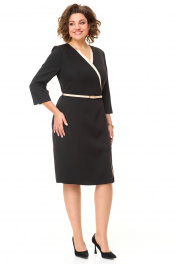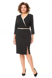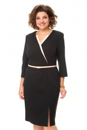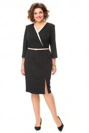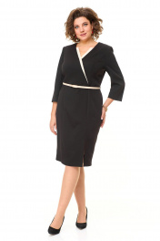 Платье женское полуприлегающего силуэта с естественной линией плеча. Рукав 3/4 втачной двухшовный с разрезом в локтевом шве. Горловина V-образной формы с контрастными планками. По переду выполнены полурельефы выходящие из пройм. Спинка с вытачками. В среднем шве спинки застежка на потайную тесьму-молнию и шлица. Имеется отделочный навесной пояс.