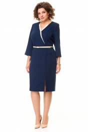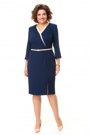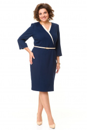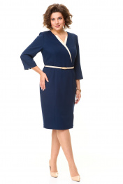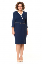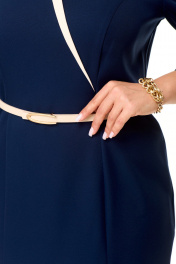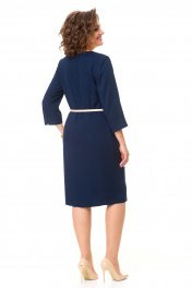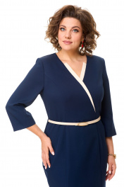 Платье женское полуприлегающего силуэта с естественной линией плеча. Рукав 3/4 втачной двухшовный с разрезом в локтевом шве. Горловина V-образной формы с контрастными планками. По переду выполнены полурельефы выходящие из пройм. Спинка с вытачками. В среднем шве спинки застежка на потайную тесьму-молнию и шлица. Имеется отделочный навесной пояс.