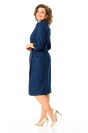 Платье женское полуприлегающего силуэта, заужено к низу. Центральная бортовая застёжка на кнопки. Перед и спинка с рельефами и отделочными строчками. Низ борта имеет оригинальную закругленную форму. По переду имеются карманы с отрезным бочком. Воротник пиджачного типа. Рукав втачной одношовный с легкой сборкой по окату. Плечевой пояс для придания изящества слегка заужен. Низ рукава с манжетой и складками. Манжета с застёжкой на кнопку. Имеется навесной пояс с отделочной пряжкой. Для поддержания пояса имеются шлёвки.