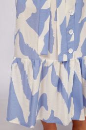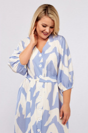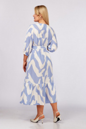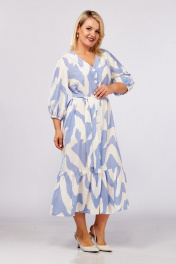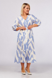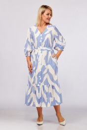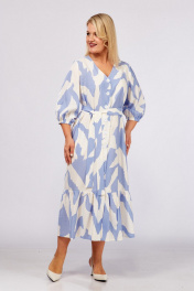 Платье женское А-образного силуэта с естественной линией плеча.Рукав втачной длиной 3/4. Низ рукава обработан резинкой.Горловина V-образной формы.Перед с нагрудной вытачкой и застежкой на петли-пуговицы.По низу переда и спинки обработана оборка.В боковых швах обработаны карманы.В комплект входит съемный пояс.