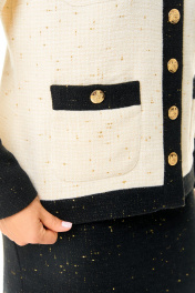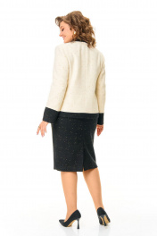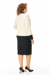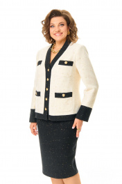 Костюм женский состоит из жакета и юбки. Жакет свободного покроя с естественной линией плеча на подкладке.Спинка со средним швом.Перед с нагрудными вытачками и накладными карманами.По переду обработана отрезная планка плавно переходящая в воротник стойку.Вырез горловина V-образной формы.Застежка центрально-бортовая на петли-пуговицы.Рукав двухшовный длинный с отрезной манжетой.Юбка на подкладке зауженного силуэта типа "карандаш".В среднем шве заднего полотнища застежка на потайную тесьму-молнию и шлица.Пояс притачной с резинкой в боковых швах.Вся фурнитура металлическая premium качества.