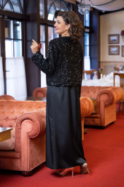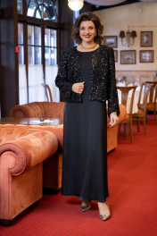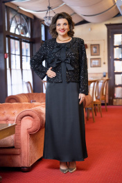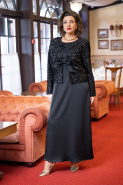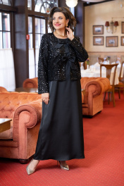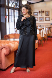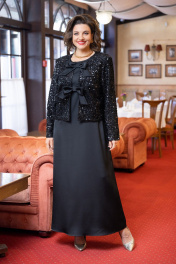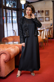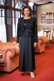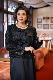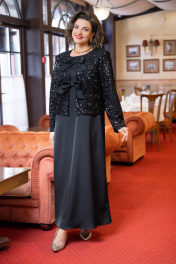 Комплект женский состоит из укороченного жакета из полотна с пайетками и атласного платья.Жакет прямого силуэта свободного покроя с естественной линией плеча на подкладке из атласной ткани.Горловина округлой формы.БАНТЫ СЪЁМНЫЕ!Застежка на съемные декоративные авторские банты с применением потайного крепления на небольшие кнопки, для возможности создания различных образов, как с бантами, так и без них.Платье женское свободного покроя расширенное к низу.Горловина округлой формы.Спинка со средним швом и застежкой на тесьму-молнию.Рукав цельнокроеный типа "летучая мышь".