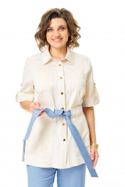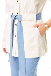 Костюм женский состоит из жакета и брюк. Жакет прямого свободного покроя с естественной линией плеча.Застежка центральная бортовая с отрезной планкой на кнопки.Воротник блузочный, отложной.Рукав втачной одношовный, короткий, с отложной манжетой и патой.Перед с нагрудными вытачками.По спинке и переду обработана отрезная кокетка.На спинке имеется встречная складка.Перед с накладными нагрудными и боковыми карманами разной формы. Верхняя часть боковых карманов является шлевками, в которые втянут навесной пояс контрастного цвета.В боковых швах обработаны разрезы.Брюки свободные прямого силуэта.Пояс притачной на резинке.В боковых швах карманы.