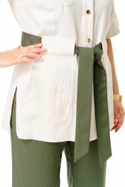 Костюм женский состоит из жакета и брюк. Жакет прямого свободного покроя с естественной линией плеча.Застежка центральная бортовая с отрезной планкой на кнопки.Воротник блузочный, отложной.Рукав втачной одношовный, короткий, с отложной манжетой и патой.Перед с нагрудными вытачками.По спинке и переду обработана отрезная кокетка.На спинке имеется встречная складка.Перед с накладными нагрудными и боковыми карманами разной формы. Верхняя часть боковых карманов является шлевками, в которые втянут навесной пояс контрастного цвета.В боковых швах обработаны разрезы.Брюки свободные прямого силуэта.Пояс притачной на резинке.В боковых швах карманы.