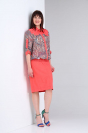 Комплект женский юбки+ блуза. Блуза свободного кроя из шифоновой+ отделочной ткани. Блуза с рубашечным воротником с частично растегивающейся планкой. Нижний срез блузы обработан эластичной планкой. Рукав втачной 3/4 с манжетом и отделочным элементом пата. Юбка прямая, верхний срез обработан поясом (частично вставлена резинка ). Отделочным элементом задней половинки юбки являются накладные карманы.Застежка на молнию в среднем шве задней половинки. Для движения в юбке обработаны шлицы по передней и задней половинке. Длина блузы по спинке = 61см Длина рукава = 47см Длина юбки 62см