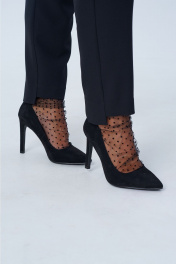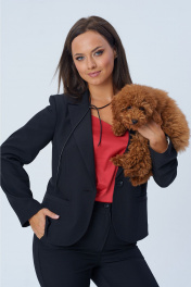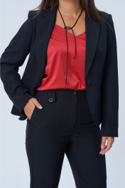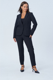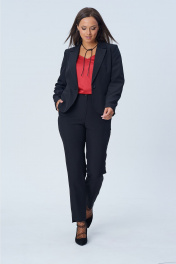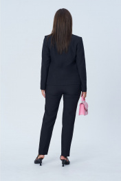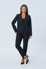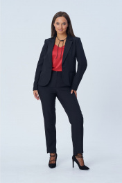 Костюм женский двухпредметный, состоящий из жакета и брюк. Жакет полуприлегающего силуэта с центральной бортовой застёжкой на одну петлю-пуговицу до линии перегиба лацкана. Перед с талиевой вытачкой и прорезным карманом с листочкой с втачными концами. Спинка со средним швом. Рукав втачной двухшовный длинный. Воротник пиджачного типа. Брюки классического кроя, слегка зауженные к низу с притачным поясом с резинкой по задним половинкам брюк. Брюки с наклонным к боковому шву карманом и двумя фигурными хлестиками на одну пуговицу по поясу передних половинок. Застёжка на тесьму - молнию и одну петлю-пуговицу по поясу. Низ брюк имеет фигурную форму - укорочена по передним половинкам и удлинённые по задним. Длина жакета по спинке - 59 см. Длина рукава - 61 см. Длина брюк по боковому шву - 96 см.