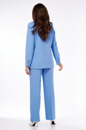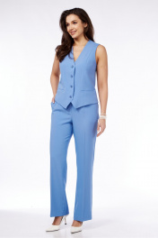 Костюм женский 3-х предметный, полуприлегающего силуэта. Состоит из жакета и жилета на подкладке и брюк. Жакет с воротником пиджачного типа, центральной застёжкой на 1 петлю и 1 пуговицу. Перед с рельефными швами от пройм до низа и талиевыми вытачками и прорезными карманами с листочками с втачными концами. Спинка со средним швом. Рукав втачной, двухшовный, длинный со шлицей. Жилет с рельефными швами от пройм до низа по переду и спинке, с центральной застёжкой на 4 петли и 4 пуговицы. Перед с прорезными карманами с листочками с втачными концами. Брюки с застёжкой на тесьму "молнию" в средних срезах передних половинок, с притачным поясом на 1 петлю и 1 пуговицу и резинкой по задним половинкам, с карманами наклонными к боковым швам. По передним и задним половинкам заутюженные канты. Длина жакета по спинке - 70 см. Длина рукава - 61 см. Длина жилета по спинке - 53 см. Длина брюк по боковому шву - 101 см.