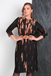 Платье женское полуприлегающего силуэта. Перед с нагрудными вытачками, спинка со средним швом, заканчивающимся шлицей. Рукав втачной, двухшовный, с разрезом в локтевом шве, длиной 3/4. Горловина круглая, углубленная, обработана обтачкой. Платье укомплектовано декоративным поясом. Длина платья по спинке - 107 см. Длина рукава - 48 см.
