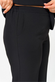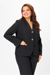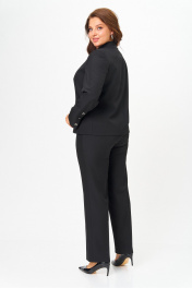 Костюм женский двухпредметный, состоящий из жакета и брюк. Жакет полуприлегающего силуэта на подкладке с центральной бортовой застежкой на 2 декоративные петли-пуговицы. Перед с талиевой вытачкой, отрезным бочком и карманом с листочкой. Борт имеет закругленную форму. Горловина оформлена фигурно с цельнокроенной стойкой по переду и с отрезной по спинке. Спинка со средним швом. Рукава втачные двухшовные с отлетной шлицей, открытой с настрочной декоративной тесьмой, двумя блочками и одной петлей-пуговицей. Брюки классического кроя, слегка зауженные к низу, с притачным поясом сзади на резинке. Застежка на тесьму-молнию и одну петлю-пуговицу по поясу. Карман фигурной формы, с отрезным бочком. На изделии заутюжены стрелки.