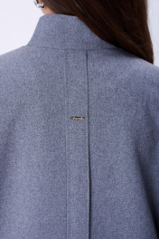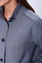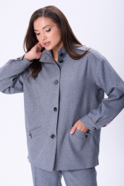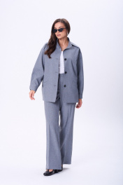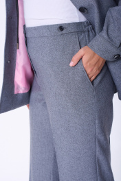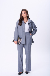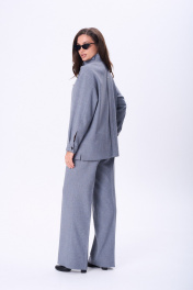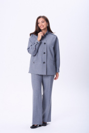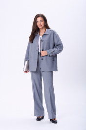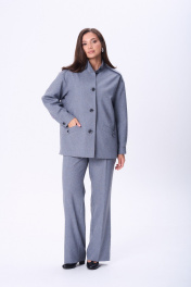 Костюм женский двухпредметный, состоящий из жакета и брюк. Жакет со спущенной линией проймы, удлиненный, прямого силуэта, с разрезами по боковым швам и с центральной бортовой застежкой на 5 петель-пуговиц. В изделии обработаны карманы листочки с хлястиком на 1 петлю-пуговицу. В плечевые швы вставлены погоны. Спинка с отстроченной и зашитой складкой по центру изделия, имитирующей планку , с пришитой эмблемой. Воротник-стойка. Рукав рубашечный, длинный, одношовный, с притачной манжетой на 1 петлю-пуговицу. Шов рукава обработан разрезом по низу. Брюки-палацо, с притачным поясом сзади на резинке и с хлястиком по поясу на 1 петлю-пуговицу. Застежка на тесьму-молнию и 1 петлю-пуговицу по поясу. В изделии обработаны карманы, наклонные к боковому шву. На брюках заутюжены стрелки.