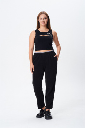 Костюм женский двухпредметный, состоящий из жакета и брюк. Жакет скомбинирован из двух видов ткани. Жакет полуприлегающего силуэта, с центральной бортовой застежкой на 2 петли-пуговицы. Перед с вытачками, выходящими из горловины. Перед с карманом с листочкой и отделочной тесьмой. Спинка с горизонтальной кокеткой, на которую настрочен элемент отделочной тесьмы. Рукав втачной трехшовный, с притачным манжетом. По передней части рукава в среднем шве по низу обработана шлица. Воротник пиджачного типа. Борт имеет закругленную форму. По борту, лацкану, воротницу, манжетам проложены отделочные контрастные строчки. Брюки заужены к низу, с притачным поясом на резинке, скомбинированным из двух видов ткани. В боковых швах фигурные карманы.