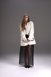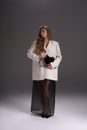 Удлиненный жакет прямого кроя из костюмной ткани. Отложной воротник с лацканами. Длинные рукава с подплечниками. На подкладке. Застежка на пуговицу. По спинке удлиненная шлица 60 см. Длина изделия 75 см. Длина рукава 65 см