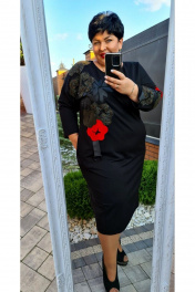 Платье - мгновенный хит. В сочетании с яркими акцентами чёрный цвет смотрится особенно эффектно. Красивая вышивка- шик! Платье свободного силуэта овал со спущенной линией плеча. По переду с левой стороны расположена вышивка- аппликация, в низу изделия выполнены силуэтные вытачки, вырез горловины округлой формы, обработан бейкой. По спинке расположена V- образная вставка из сетки и имитация застёжки с пришивными пуговицами, в низу изделия расположены силуэтные вытачки. В боковых швах обработаны карманы. Рукав втачной со спущенной линией плеча. Длина рукава с учетом плеча 57 см (р-р 52-56), 58 см (р-р 58-62). Длина платья 106 см (р-р 52-56), 110 см (р-р 58-62). платье 52 54 56 58 60 62 обхват бедер 120 124 128 132 136 140 обхват рукава внизу 30 31 31 32 32 32