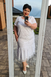 Волшебное платье! Лаконичный крой смотрится стильно и эффектно, а вышивка ришелье придаёт платью романтичные нотки. Платье А- образного силуэта, на подкладке. По переду расположены нагрудные вытачки, горизонтальный подрез с кружевной тесьмой в области талии, волан с лёгкой сборкой и с фестонами по низу, вырез горловины округлой формы, обработан тесьмой и украшен съёмной брошью. По спинке расположен подрез с кружевной тесьмой в области талии, талиевые вытачки и волан с лёгкой сборкой. Рукав втачной, низ рукава обработан рюшей и кружевом. Длина рукава 21 см во всех размерах. Длина платья 115 см (р-р 50-54), 117 см (р-р 56-58), 119 см (р-р 60-64). платье 50 52 54 56 58 60 62 64 обхват груди 108 112 116 120 124 128 132 136 обхват талии 106 110 114 118 122 126 130 134 обхват бедер 118 122 126 130 134 138 142 146 обхват рукава на уровне проймы 38 40 42 44 46 48 50 52