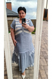 Суперплатье- настоящий хит летнего сезона! Любимый джинсовый цвет - цвет №1 по версии международных изданий, модный и свободный крой- слагаемые любимого платья. Комфортное платье имитация двойки А-образного силуэта выполнено из тканей компаньонов. На лифе расположен Т-образный подрез с нагрудными вытачками и настроченной декоративной кружевной тесьмой, пришивными бусинами, в нижней части вертикальные и горизонтальные подрезы с отделочными рюшами и кружевной тесьмой. Вырез горловины округлой формы, обработан притачной бейкой. Верхняя часть спинки в полоску, расположенную по диагонали, со средним швом, нижняя часть повторяет перед. В боковых швах расположены удобные карманы. Рукав втачной с декоративных рюшей по низу. Длина рукава 18 см (р-р 52-56), 20 см (р-р 58-62). Длина изделия 134 см (р-р 52-56), 136 см (р-р 58-62). платье 52 54 56 58 60 62 обхват груди 110 114 118 122 126 130 обхват талии 108 112 116 120 124 128 обхват бедер 136 140 144 148 152 156 обхват рукава на уровне проймы 39 41 43 45 47 49