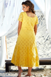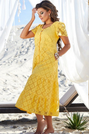Кусочек солнышка в вашем гардеробе! Очень красивое, яркое с вышивкой на хлопке. Силуэт полуприлегающий, немного расклешенный к низу, с застежкой планкой на петли и пуговицы. По переду горловина фигурной формы, по окату рукава вставка из резинки на сборке, фигурный подрез по лифу, нагрудные вытачки, по центру застежка планка на петли и пуговицы, по линии талии подрез с притачным поясом, декоративные вставки из однотона, фигурные карманы, по низу 2 волана на сборке. Спинка с фигурным вырезом, притачной пояс со вставками из однотона, талиевые вытачки, 2 подрезных волана на сборке. Рукав втачной одношовный. Платье на подкладке. Длина рукава 20 см. Длина платья 131 см (р 52,54,56), 134 см (р 58,60,62) платье 52 обхват груди 106 обхват талии 104 обхват бедер 124 обхват рукава на уровне проймы 45