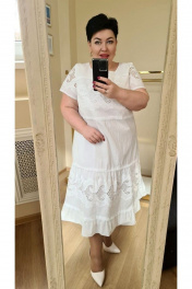 Как же прекрасно вы будете выглядеть в этом платье, ведь оно невероятно нежное и удобное! Красивая вышивка на хлопке придает ему роскошность и изящность! Горловина округлой формы, по краю вставлено кружево, лиф с вертикальными подрезами и вставкой из кружева, нагрудные вытачки, нижняя часть со вставкой из кружева и ришелье, нижний волан на сборке с кружевной тесьмой. Спинка с фигурным вырезом и завязками на бант, по центру красивая вставка из ришелье, по бокам подрезы с кружевом, по низу вставка из ришелье и кружевной тесьмы, нижний волан на сборке со вставкой из кружева. Рукава втачные, одношовные, по низу кружевная тесьма. Платье на подкладке. Длина платья 111 см (50,52,54), 114 см (56,58,60). Длина рукава 21 см. платье 50 52 54 56 58 60 обхват груди 108 112 116 120 124 128 обхват талии 106 110 114 118 122 126 обхват бедер 120 124 128 132 136 140 обхват рукава на уровне проймы 39 41 43 45 47 49