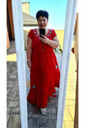В этом грациозном платье- настоящий заряд позитива. Вышивка смотрится шикарно, а силуэт и макси длина создают дорогой образ. Платье, отрезное по линии талии, полуприлегающее в верхней части и расклешённое в нижней. По переду расположены вытачки, фигурная вставка по центру, в деталях юбки расположены горизонтальные подрезы, в боковых швах расположены карманы. По спинке расположены талиевые вытачки, горизонтальные подрезы и воланы. Рукав втачной. Длина рукава 12 см. Длина платья 139 см (р-р 50-54), 140 см (р-р 56-60). платье 50 52 54 56 58 60 обхват груди 106 110 114 118 122 126 обхват талии 94 98 102 106 110 114 обхват бедер ширина рукава вверху 38 40 42 44 46 48