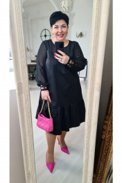 Коко Шанель говорила, что у каждой девушки должно быть маленькое черное платье! Особый шарм платью придаёт сочетание фактур ткани. Платье А-силуэта с воланом, рукав и кокетка переда и спинки платья из шифона в фактурную точку. Рукав платья втачной длинный, манжет из кружева с застёжкой на пуговицы. Спинка платья без среднего шва, по кокетке вырез капелька и застёжка на пуговицу. Длина платья от высшей точки плечевого шва до низа 105 см (р.50-54), 107 см (р.56-60). Длина рукава 62 см. платье 50 52 54 56 58 60 обхват груди 108 112 116 120 124 128 обхват бедер 120 124 128 132 136 140 ширина рукава вверху 38 40 42 44 46 48