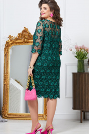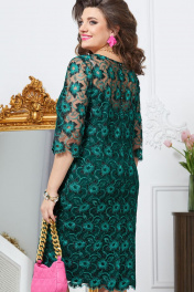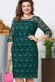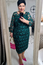 Эффектное, красивое платье из гипюра полуприлегающего силуэта. Вырез горловины округлой формы. По переду расположены талевые и нагрудные вытачки, по спинке талевые вытачки. Спинка со средним швом и шлицей, вверху имитация застёжки из пришивных бусин. Низ в гипюре выложен фестонами. Перед и спинка выполнены с подложкой имитацией кокетки из сетки. В левом боковом шве потайная застежка-молния. Рукав втачной, одношовный с фестонами по низу. Длина платья 105 см (р. 50-54), 107 см (р. 56-60). Длина рукава 50 см. платье 50 52 54 56 58 60 обхват груди 106 110 114 118 122 126 обхват талии 100 104 108 112 116 120 обхват бедер 114 118 122 126 130 134 ширина рукава вверху 38 40 42 44 46 48