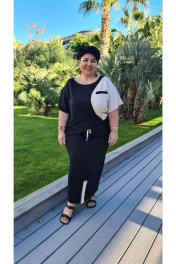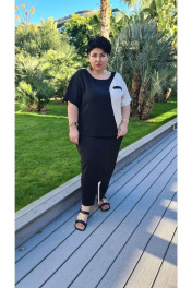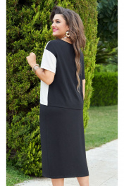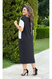 Шикарный летний женский костюм, состоящий из блузки и прямой юбки длины миди. Костюм, в котором комфортно гулять даже в самую жаркую погоду, идеален для путешествия, прогулок, а так же отлично подойдёт для работы в офисе. В данном костюме отлично сочетается классический чёрный цвет с ярким акцентом в виде вставок. Блуза прямого силуэта с округлой горловиной и контрастной вставкой из той же ткани. Линия плеча спущена, рукав втачной, короткий, контрастных цветов. По переду блузы идёт фигурный рельеф и листочка кармана по груди. Спинка блузы без особенностей, в боковых швах имеются разрезы. Юбка прямого силуэта длины миди с притачной планкой и разрезом по переду. Пояс в юбке притачной, на резинке с декоративным шнуром. Заднее полотнище юбки без особенностей. В качестве акцента юбки — яркая вставка, которая служит продолжением планки. По планке юбки в качестве декоративного элемента нашивается эмблема. Универсальный модный летний костюм станет отличной базой в Вашем гардеробе. Обращаем ваше внимание, что фурнитура может незначительно отличаться от фото. Длина блузона вдоль середины спинки 65 см (р.52-56), 67 см (р.58-62). Длина рукава блузона с учетом плеча 33-37 см (в зависмости от размера). Длина юбки по среднему срезу заднего полотнища с поясом 86 см (р.52-56), 87 см (р.58-62). блузон 52 54 56 58 60 62 обхват груди 116 120 124 128 132 136 обхват талии обхват бедер 122 126 130 134 138 142 ширина рукава вверху 44 44 44 50 50 50 юбка 52 54 56 58 60 62 ширина по талии (с резинкой) 84 88 92 96 100 104 ширина на уровне линии бедер 116 120 124 128 132 136