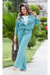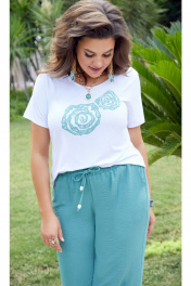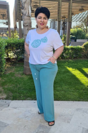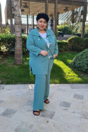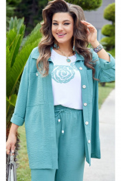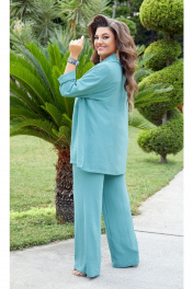 Лёгкий и удобный женский летний комплект, в котором комфортно гулять даже в самую жаркую погоду. Данная модель подойдёт как для похода на работу, так и для отдыха в парке, в путешествии, в отпуске. Комплект женский трёх-предметный, состоящий из удлинённого жакета, брюк и блузки. Жакет свободного силуэта (без подкладки) с центральной застёжкой на пуговицы по переду и отложным воротником. Линия плеча в жакете спущена, рукав длиной три четверти с отложной манжетой. По переду жакета имеются декоративные подрезы и объёмные накладные карманы. По спинке жакета есть кокетка. В боковых швах жакета имеются разрезы. Блузка свободного силуэта с округлой горловиной, без нагрудных выточек. Рукав в блузке втачной, короткий. По полочке декоративный элемент в виде дизайнерского принта. Брюки имеют прямой свободный крой с заутюженными стрелками. Пояс в брюках притачной на резинке со шнуром. По переду брюк прорезные карманы. Универсальный модный летний комплект станет отличной базой в Вашем гардеробе. Обращаем ваше внимание, что фурнитура может незначительно отличаться от фото. Длина жакета вдоль середины спинки от шва втачивания воротника - 77 см. Длина рукава жакета 36 см. Длина блузки от плеча 65 см (р.52-56), 67 см (р.58-62). Длина рукава блузки 20 см. Длина брюк по боковому шву с поясом 107 см. жакет 52 54 56 58 60 62 обхват груди 120 124 128 132 136 140 обхват талии ширина изделия на уровне линии бедер 124 128 132 136 140 144 ширина рукава вверху 43 43 43 45 45 45 брюки 52 54 56 58 60 62 ширина на уровне среднего шва 116 120 124 128 132 136 ширина по линии талии (с резинкой) 84 88 92 96 100 104 блузка 50 52 54 56 58 60 обхват груди 104 108 112 116 120 124 ширина изделия на уровне линии бедер 112 116 120 124 128 132 ширина рукава вверху 36 38 41 43 45 47