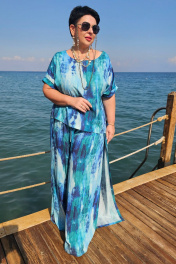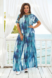 Состав: 100% вискоза. Невероятно красивый костюм с ярким принтом, который всегда в тренде! Легкий, летящий, буквально невесомый, подчеркнет красоту вашей фигуры и скроет недостатки и станет отличным дополнением в Вашем гардеробе. Блузка прямого силуэта с округлой формой горловины. Рукав цельнокроеный с отложной манжетой по низу. В боковых швах блузки разрезы от низа. Спинка без особенностей. Брюки прямого силуэта, широкие с декоративным элементом в виде «запаха» по боковым швам. Пояс в брюках притачной на резинке, которая обеспечивает максимально комфортную посадку на любой тип фигуры. В боковых швах пояса дополнительный декоративный элемент в виде лент завязывающихся на бант. Длина блузки от верхней точки плеча 62 см. Длина брюк по боковому шву с поясом 106 см блуза 50 52 54 56 58 60 обхват груди 112 116 120 124 128 132 обхват талии ширина изделия на уровне линии низа122 126 130 134 138 142 брюки 50 52 54 56 58 60 ширина на уровне среднего шва 116 116 124 124 132 132 ширина по линии талии (с резинкой) 80 84 88 92 96 100