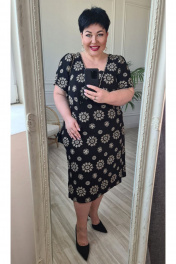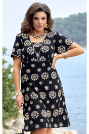 Летнее стильное женское платье с коротким рукавом - идеальное дополнение к гардеробу модницы. Это женственное платье с очаровательным вышитым дизайном идеально подходит для вечерних прогулок, отдыха, а также для работы в офисе. Сочетание чёрного цвета с бежевым дизайном придаёт платью своеобразную яркость. Платье без подкладки, длина плюс-минус середина колена (в зависимости от роста), расширяется к низу. По переду платья подрез под грудью и талиевые вытачки, горловина с V-образным вырезом, красиво выложенными фестонами, и треугольной вставкой. Рукав в платье короткий с фестонами по низу. Спинка в платье без особенностей. Низ в платье ровный. Длина платья от высшей точки плечевого шва до низа 103 см (р.50-54), 106 см (р.56-60). Длина рукава 24 см. платье 50 52 54 56 58 60 обхват груди 106 110 114 118 122 126 обхват талии 104 108 112 116 120 124 обхват бедер 120 124 128 132 136 140 ширина рукава вверху 46 48 50 52 54 56