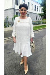 Стильное платье в стиле «шанель» в ткани с вкраплением мелких пайеток добавит Вашему образу утончённости, в нём Вы будете чувствовать себя неотразимой! Платье А-силуэта, с округлой формой горловины с отрезной кокеткой и вставкой из бахромы в подрезе. По переду платья нагрудные вытачки, и декоративные накладные элементы в виде листочек с отделочной бахромой. По низу платья притачной волан. Спинка в платье с талиевыми вытачками. Рукав втачной, длиной ¾ с декоративным элементом в виде паты с бахромой по низу. В качестве дополнительного декоративного элемента в комплекте идёт брошь. Обращаем Ваше внимание, что фурнитура может незначительно отличаться от фото. Длина платья от высшей точки плечевого шва до низа 100 см (р.48-52), 102 см (р.54-58). Длина рукава 48 см. платье 48 50 52 54 56 58 обхват груди 106 110 114 118 122 126 обхват талии обхват бедер 116 120 124 128 132 136 ширина рукава вверху 35 37 39 40 42 44
