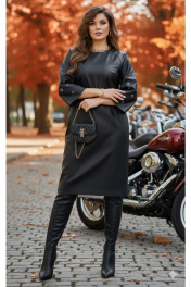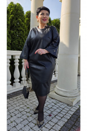 Платье полуприлегающего силуэта с округлой формой горловины. По переду платья нагрудные вытачки. По спинке застёжка на декоративную тесьму молнию в среднем шве платья и разрезом от низа. Рукава становятся главным акцентом: ряд люверсов и кнопок, выстроенных словно доспехи, придают образу дерзкий, почти урбанистический шик. Рукав в платье реглан, расширяется к низу, длиной 7/8. В боковых швах платье карманы. Длина платья 109 см (р 50-54), 111 см (р 56-60). Длина рукава 61 см.