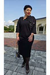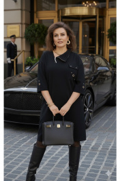 Платье свободного силуэта, горловина ассиметричной формы. По переду платья фигурная кокетка с функциональной молнией, нагрудный карман с клапаном и декоративной отделкой в виде металлической фурнитуры. Линия плеча спущенная, рукав втачной, длиной ¾, широкий к низу. Спинка в платье со средним швом заканчивающимся разрезом. В боковых швах платья карманы. Длина платья 106 см (р 50-54), 108 см (р 56-60). Длина рукава 30,5 см.
