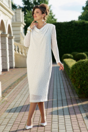 Это платье сотканное из тончайшего трикотажа с деликатной фактурной основой и тончайшей люрексовой ниткой. Полотно платья свободно ниспадает от плеч, даря свободу движения. Платье прямого силуэта с акцентной деталью в виде качели по переду платья, с заложенными складками по плечу. Линия плеча имеет ровную форму. Рукав втачной, длинный.Длина платья от высшей точки плечевого шва до низа 118 см (р 48-52), 120 см (р 54-58). Длина рукава 65 см.