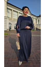 Данный костюм отлично подходит для торжественных мероприятий, свиданий, работы в офисе если дополнить его соответствующими аксессуарами и обувью Блузка свободного силуэта, с фигурной линией горловины по форме «лодочка»; по переду блузки нагрудные вытачки. По спинке блузки вырез капелька с застёжкой на пуговицу. Рукав втачной, длинный с фигурным вырезом, по низу рукава манжета с застёжкой на петли пуговицы. Брюки-кюлоты свободного силуэта, длиной 7/8 расширяются к низу. Пояс притачной со вставкой эластичной тесьмы-резинки, которая обеспечивает максимально удобную посадку на любой тип фигуры. По переду брюк от верха застрачиваются складки. В задней части брюк застёжка на тесьму-молнию в шве и пуговицу в поясе. В боковых швах брюк - карманы. Длина блузки от высшей точки плечевого шва до низа 60 см (р 50-54), 61 см (р 56-60). Длина рукава 61 см (р 50-54), 62 см (р 56-60). Длина брюк по боковому шву от шва притачивания пояса 93 см (р 50-54), 94 см (р 56-60).