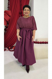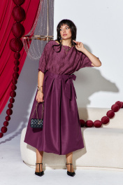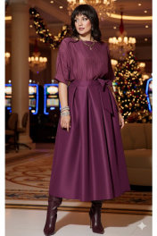 Невероятно красивое и элегантное платье отвечает всем требованиям вечернего наряда! Сочетание тканей разных фактур и дизайнов в одной модели - тренд сезона. Это элегантное платье миди состоит из двух частей, создающих впечатление комплекта. Верхняя часть платья выполнена из плиссированной ткани, что придаёт ему текстурный и динамичный вид, а юбка с атласным блеском придаёт изделию нарядность, гармонично дополняющего верх. Высокая талия юбки визуально удлиняет фигуру. Общий ансамбль выглядит изысканно и подходит как для повседневных, так и для более официальных мероприятий. Сочетание различных фактур и оттенков винного создаёт глубокий и сложный образ. Дополнительные детали, такие как золотые украшения и туфли с шипами, придают платью особый шарм. Платье приталенного силуэта, с округлой формой горловины, рукав цельнокроенный, длинной ¾. В плечевом шве платья декоративная вставка рюши. Лиф платья на подкладке. Пояс в платье притачной со вставкой резинки по спинке, с застроченными складками от пояса по юбке платья. Юбка в платье «балон», на подкладке. Пояс в платье декорирован бантом в виде съемной броши. Длина платья 134 см (р 50-54), 135 см (р 56-60). Длин рукава 40 см. Платье 50 52 54 56 58 60 обхват груди 108 112 116 120 124 128 обхват талии 88/104 92/108 96/112 100/116 104/120 108/124 обхват бедер 130 134 138 142 146 150