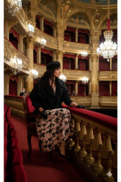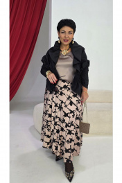 Женский комплект состоит из трёх элементов, каждый из которых дополняет другой, создавая гармоничную и современную образность. Жакет (состав: 55% хлопок, 40% полиамид, 5% спандекс) - «оверсайз» силуэта, выглядит свободной на силуэте, её пространство вокруг плеч и линии талии напоминает мягкую волну одежды, которая свободно дышит и передаёт непринуждённую уверенность. Декоративные резинки с эффектом сборки вдоль рукавов, по деталям переда добавляют игривую динамику. Он будто приглушённый акцент в ансамбле — она подчёркивает силуэт сверху без утяжеления, оставляя место для свободной игры ткани. Блуза (состав: 100% полиэстер) в нежном бежевом оттенке, который гармонично сочетается с насыщенным чёрным цветом комплекта. Блуза прямого силуэта с округлой формой горловины и нагрудными вытачками по полочке. Спинка без особенностей. Низ в блузе фигурной формы.Юбка (состав: 50% район, 50% вискоза, подкладка 100% полиэстер) баллон из ткани с принтом, конической формы, расширяется к низу. Пояс в юбке притачной в виде декоративной эластичной тесьмы-резинки, а боковом шве застёжка на потайную тесьму-молнию. Юбка на подкладке. Длина спинки жакета 61 см, длина рукава 33 см. Длина блузки по спинке 63,5 см (р 48-52), 64 см (р 54-58), ширина плеча 8 см. Длина юбки 88 см (р 48-52), 89 см (р 54-58). Жакет 48 50 52 54 56 58 ширина на уровне проймы 120 120 120 132 132 132 ширина рукава вверху 44 44 44 51 51 51 Блуза 48 50 52 54 56 58 ширина на уровне проймы 102 106 110 114 118 122 обхват талии 101 105 109 113 117 121 Юбка 48 50 52 54 56 58 обхват талии 76/104 80/108 84/112 88/116 92/120 96/124 обхват бедер 140 144 148 152 156 160