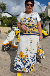 Костюм женский состоящий из блузы и юбки. Этот костюм — не просто одежда, а перенесённый на ткань кусочек итальянского лета. Яркий цветочный принт на светлой основе напоминает о залитых солнцем тосканских холмах, о внутренних двориках с терракотовыми горшками, о рынках, где горами лежат спелые овощи и фрукты. Это гимн средиземноморской радости жизни, воплощённый в блузе и юбке. Принт — это не случайный узор, а тщательно составленная композиция, вдохновлённая итальянской флорой и искусством. Блуза сконструирована так, чтобы быть одновременно удобной и изысканной. Крой — свободный, горловина округлой форм, линия плеча спущенная. По плечу декоративная застёжка в виде «навесных» петель и пуговиц, которая придаёт блузе лёгкости. По переду и спинке отрезная кокетка из однотона. В боковых швах от низа разрезы. Юбка — это продолжение блузы. Форма — трапециевидная, расширяющаяся от талии. Объём достаточный для свободы движения, но не переходящий в пышность. Длина «миди» создаёт более романтичный образ. Пояс в юбке притачной, на обтачке, по переду имитация застёжки на «навесные» петли и пуговицы. По низу юбки притачной волан со сборкой от подреза. Этот костюм для женщины, которая: любит жизнь — во всей её полноте и яркости. Ценит искусство — понимает, что одежда может быть произведением искусства. Обладает темпераментом — не боится быть заметной, но делает это со вкусом. Блуза 50 52 54 56 58 60 обхват груди 124 124 124 138 138 138 ширина по низу изделия 122 126 130 134 138 142 ширина рукава внизу 42 42 42 45 45 45 Юбка 50 52 54 56 58 60 ширина по талии 84 88 92 98 102 106 обхват бедер 132 136 140 144 148 152 ширина пояса 4,5 4,5 4,5 4,5 4,5 4,5