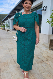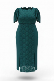 Летнее платье-футляр из кружева Ришелье в романтическом стиле из натурального хлопка на подкладке. Пластическая форма модели четкая, стройнящая и вытягивающая по вертикали благодаря вставкам и подрезам визуально собирающими фигуру и подчеркивая ее женственность. Рукава с богатой каймой присборены по окату и входят в декоративно-конструктивные подрезы переда и спинки, что визуально сужает плечевой пояс и линию груди. Вырез горловины неглубокий, открывающий ключицы и обрамлен каймой. Под грудью по переду и спинке утонченная декоративная вставка хлопковой тесьмы в цвет платья, которая создает акцент и притягивает внимание. Платье в длине миди. По рельефам спереди два разреза для удобства движения. В боковом шве молния. Платье полностью из натуральных дышащих материалов комфортное в носке на каждый день и для тожественного случая. Платье с идеальной посадкой подчеркивает талию, вытягивая фигуру. Это универсальное платье для любого повода. Длина платья 125 см. Длина рукава 33 см.