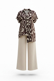 Блузка представлена как многофункциональный элемент гардероба, который сочетает в себе эстетическую глубину и практическую универсальность, становясь " холстом для образов". Крой — свободный, но не мешковатый. Универсальность — подходит для работы, встречи с друзьями, прогулки, путешествия. Современность — вне сезонных трендов, но в тренде на осознанное потребление. Блузка не облегает — она скользит. Она не описывает фигуру — она её окутывает. Блузка свободного силуэта с ассиметричной линией борта с заложенными складками, имитацией застёжки на декоративные пуговицы. Горловина в блузке с отложным воротником со стойкой. Рукав в блузке цельнокроеный. Спинка с отрезной кокеткой. Низ в блузке ассиметричный с разрезами в боковых швах. Длина блузки 69 см (р 52-56), 72 см (р 58-62). Длина брюк 108 см. Блузка 52 54 56 58 60 62 обхват груди 136 136 136 148 148 148 обхват бедер 138 138 138 150 150 150 ширина рукава вверху 46 46 46 50 50 50
