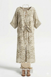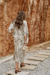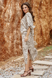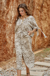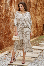 Этот костюм — не просто одежда, а настроение. Он создан для женщин, которые ценят комфорт, не отказываясь при этом от стиля и женственности. Костюм в котором комфортно гулять даже в самую жаркую погоду, станет отличной базой в Вашем гардеробе, а ненавязчивый принт изделия будет притягивать к себе взгляды. Данная модель подойдёт как для похода на работу, так и для отдыха в путешествии. Надевая этот костюм, чувствуешь: свободу движения благодаря продуманному крою, уверенность от элегантного, но неформального вида. Блуза свободного силуэта с V-образным вырезом горловины. Плавный V-образный вырез горловины — это не просто деталь кроя, а настоящая визитная карточка блузы. Он мягко обрамляет ключицы, создавая элегантный и в то же время чувственный силуэт. Цельнокроеный рукав — настоящее воплощение лёгкости. Рукав достаточно свободный, чтобы обеспечивать комфорт в летнюю жару, но при этом сохраняет форму благодаря продуманному крою. По низу притачной манжет завязывающийся на бант. По переду блузки декоративная вставка— кулиса с отделочным шнуром. Спинка со средним швом. Юбка длины «миди» с притачным поясом на резинке, который обеспечивает максимально удобную посадку на любую фигуру. По переду юбки в среднем шве и в боковых швах разрезы. По переду наклонные карманы. Длина блузы 63,5 см (р 52-56), 64 см (р 58-62). Длина юбки 84 см.